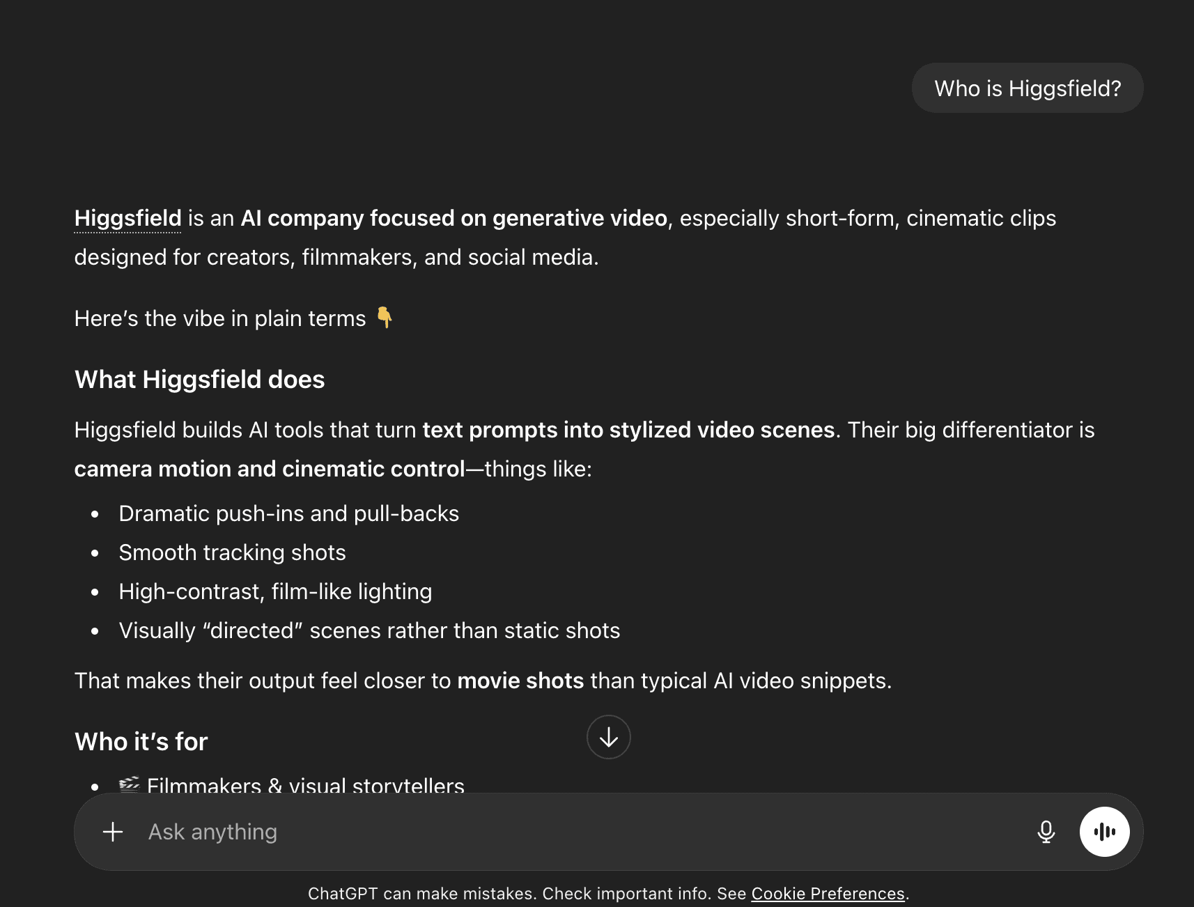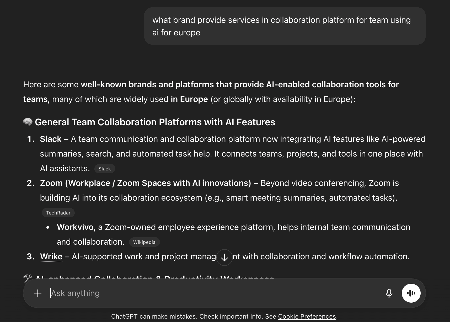 Input your queries: Ask direct questions such as “Who is [Your Brand]?” or “What brands provide [service] in [industry]?” This helps you gauge how the AI perceives your brand.